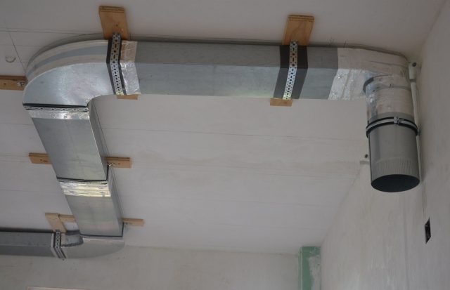 Jeden konec potrubí je připojen k ventilační šachtě a druhý je vypuštěn do budoucího stropu a připojen k ventilátoru.