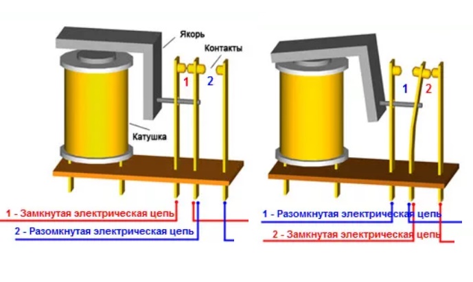 Die Arbeit magnetoelektrischer Bauelemente wird aufgrund der Wechselwirkung des Stroms im Drehrahmen mit einem durch einen Permanentmagneten erzeugten Magnetfeld ausgeführt. Die Steuerung des Schließens / Brechens der Kontakte beruht auf ihrer Drehung.