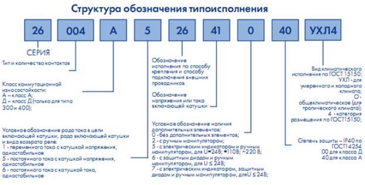 Der Schützkennzeichnungscode befindet sich häufig in Geschäftskatalogen und auf dem Gerät selbst. Es enthält eine vollständige Beschreibung der Konstruktionsmerkmale, des Zwecks und der Bedingungen ihrer Verwendung.
