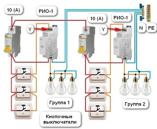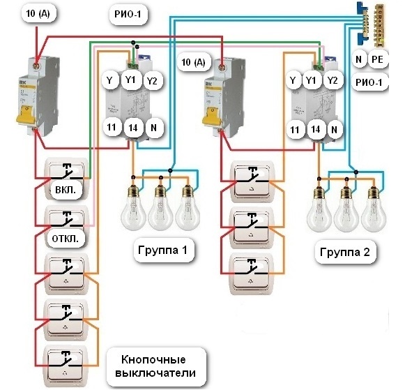 Diesem Stromkreis werden zwei Leistungsschalter hinzugefügt, um den Stromkreis zu schließen und zu öffnen. Die erste Taste kann nur die Beleuchtungsgruppe einschalten. In diesem Fall kommt die Phase vom EIN-Schalter zu den Klemmen Y1 jedes Relais und die Kontakte 11-14 werden geschlossen.
