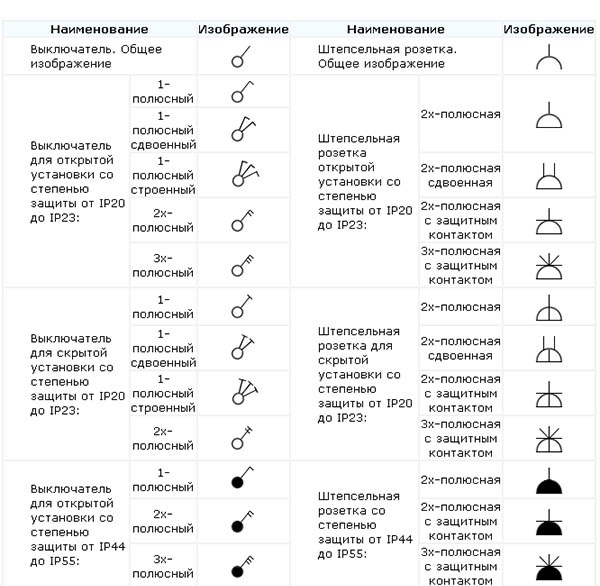 Das Symbol für Steckdosen und Schalter in den Zeichnungen hat einen einzigen Standard. Dies beseitigt Verwirrung und zeigt deutlich die Nuancen der Installationsarbeiten.