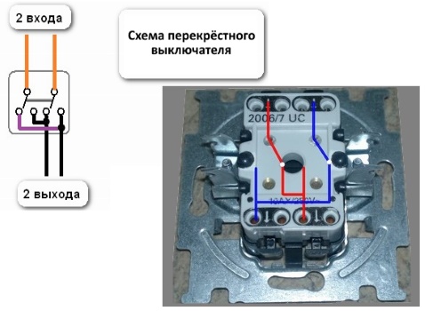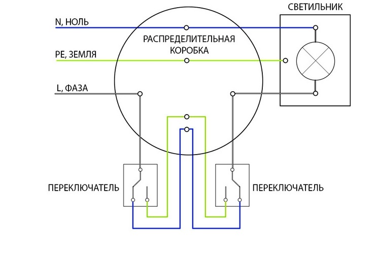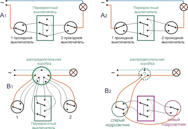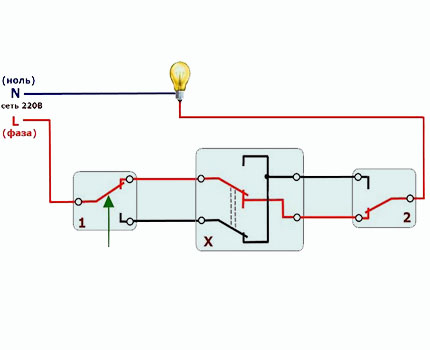 - Die Phase ist mit dem Eingangsanschluss des Durchgangsschalters verbunden. Von zwei Ausgangsklemmen führen zwei Phasendrähte zum Kreuz.