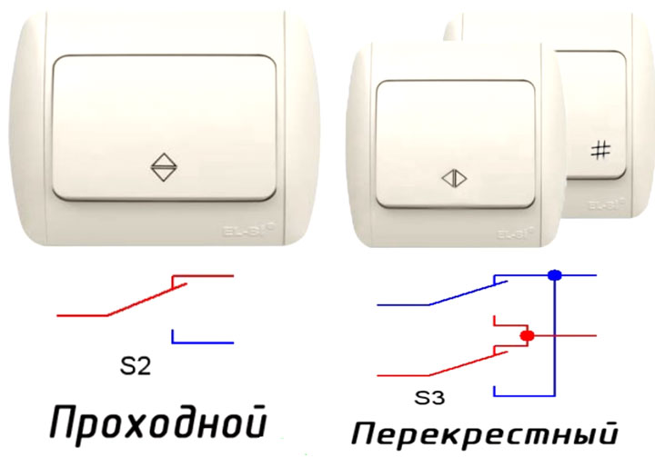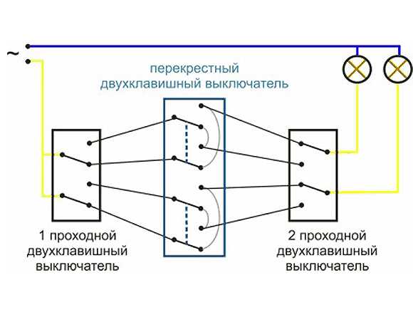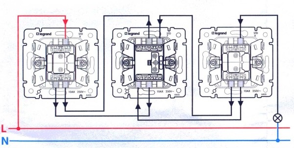 So wie die Durchgangsschalter nicht separat verwendet werden können, sondern nur paarweise angeschlossen sind, werden die Wippschalter nur mit zwei Durchgängen verwendet. In diesem Fall können bis zu 10 Kreuzschalter verwendet werden, die sich immer zwischen den Durchgängen befinden.