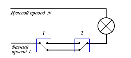 Aber seitdem Kreuzschalter Es wird immer zwischen Durchgängen installiert und wird nie alleine verwendet. Zunächst müssen Sie verstehen, wie die Schaltung zur Aktivierung und Deaktivierung der Beleuchtung mit herkömmlichen Schaltern und Durchgangsschaltern funktioniert.