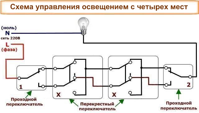 Um das Funktionsprinzip des Überkreuzungsschalters zu verstehen, muss das Steuerungsschema der Beleuchtungspunkte von 3 bis 5 Punkten untersucht werden.