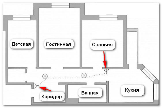 Ein Steuerungsnetzwerk von mehreren Orten hat einen erheblichen Nachteil - alle daran beteiligten Schalter haben keine feste Position. Daher kann nicht festgestellt werden, ob das Licht im Raum ein- oder ausgeschaltet ist, wenn kein Strom vorhanden ist. Durch die Installation eines herkömmlichen Schalters vor dem ersten Durchlauf wird dieses Problem behoben.