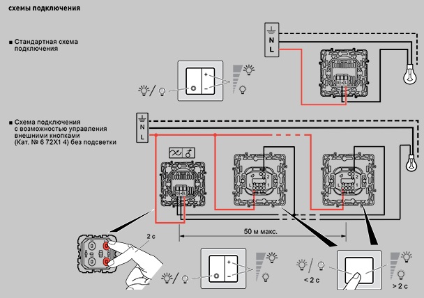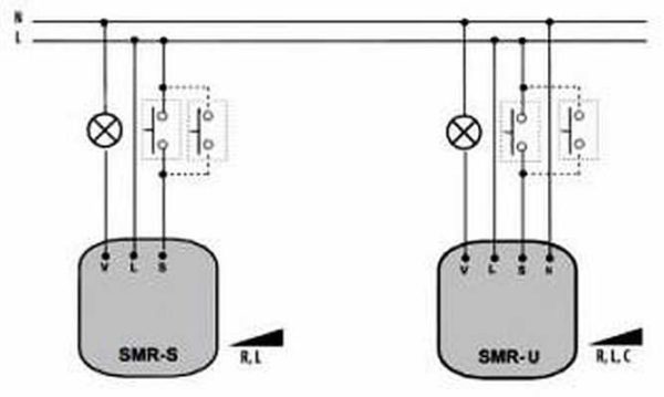 Betrachten Sie eine Reihe der beliebtesten Optionen zum Anschließen von Dimmern: direkt an den Schalter, eingebauter Typ und mit einer Fernbedienungstaste.