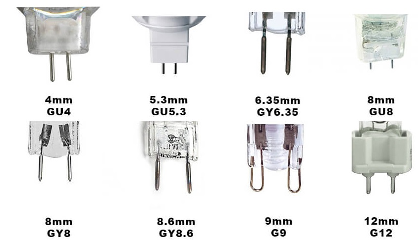 Fassungen von Niederspannungshalogenlampen mit Reflektoren - 6, 12, 24 V - können verschiedene zweipolige Anschlüsse haben. In diesem Fall geben die Zahlen den Abstand zwischen den Stiften an.