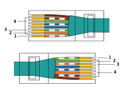 Beide Crimpschemata sehen unter Berücksichtigung der Nummerierung die Position der Leiter an den gegenüberliegenden Endsteckern vor, wenn sich der erste Draht gegenüber dem achten befindet und umgekehrt - der achte Draht befindet sich gegenüber dem ersten.