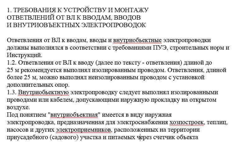 Ich halte es für notwendig, Sie zu warnen - der Lufteintritt von der Luftleitung ist zulässig. Der Kabelabstieg entlang der Unterstützung der Netzwerkorganisation erfordert eine Koordination. Die Art der Eingabe wird durch die "Leitmaterialien für die Stromversorgung von Privathäusern, Hütten, Gartenhäusern ..." geregelt. Um die Anforderungen nicht erneut zu erzählen, habe ich einen Screenshot der Dokumentseite angehängt. Sogar die Verkabelung innerhalb des Hofes sollte auf dem Luftweg erfolgen.