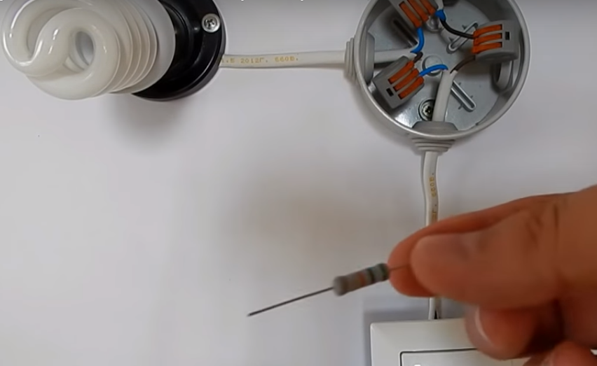 Dazu benötigen Sie einen Widerstand, der parallel zur Lampe geschaltet werden muss. 2 kW Widerstand mit einem Nennwiderstand von 50 kOhm. Ich lege visuelle Fotos der Implementierung einer solchen Verbindung bei (ohne und mit Widerstand). Der Widerstand besteht aus Schrumpffolie, um den Sicherheitsbestimmungen (grüne und rote Drähte) zu entsprechen.