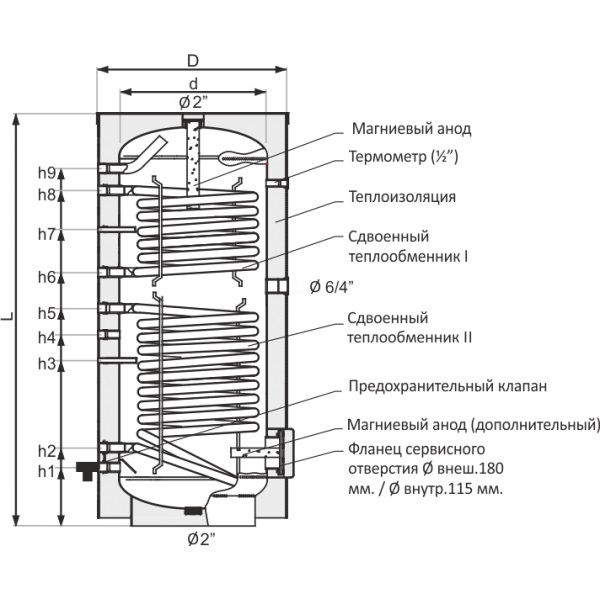 Wenn Sie einen Solarkollektor anschließen möchten, ist es besser, einen Kessel mit zwei Wärmetauschern zu wählen - wie auf dem Foto. Durch Anpassungen können Sie die Priorität der Solarheizung festlegen. Eine nützliche Zusatzfunktion ist eine unabhängige TEN-Heizung, die direkt im Kessel installiert ist. Dies ist im Sommer nützlich, wenn Sie den Kessel nicht nur zum Erhitzen von Wasser und als Backup einschalten möchten. im Falle eines Kesselausfalls.