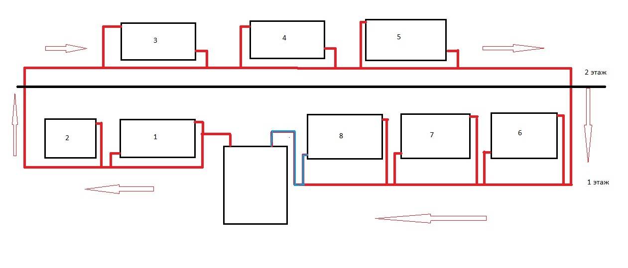 Wir kehren zu Schema 1 zurück und sehen deutlich die Mängel. Die Heizkörper 1-3 sind immer feurig, 4-6 optimale Temperaturen, aber 7-8 am kältesten. Um in Räumen mit Heizkörpern 7-8 komfortable Bedingungen aufrechtzuerhalten, muss der Kessel daher mit einer höheren Leistung eingeschaltet werden. In Räumen mit Heizkörpern 1-3 ist es jedoch so heiß, dass Sie die Fenster öffnen müssen. Die Rationalität des Gasverbrauchs ist nicht auf höchstem Niveau.