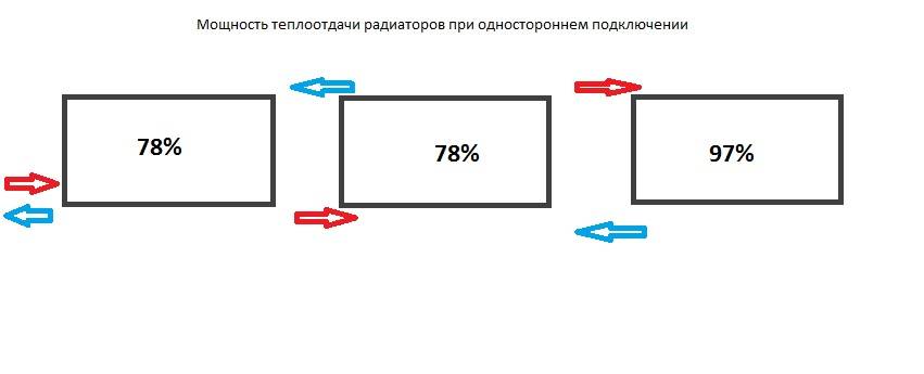 In Bezug auf die Effizienz von Heizkörpern, abhängig von ihrer Verbindung. Grundsätzlich in zwei Typen unterteilt: Einwegverbindung (Schema 2) und Zweiwegverbindung (Schema 3). Wie Sie sehen können, beträgt der Wirkungsgrad Ihrer vorgeschlagenen Verbindung 80%. Das Maximum 100% nur mit einer ähnlichen Option nur genau das Gegenteil.