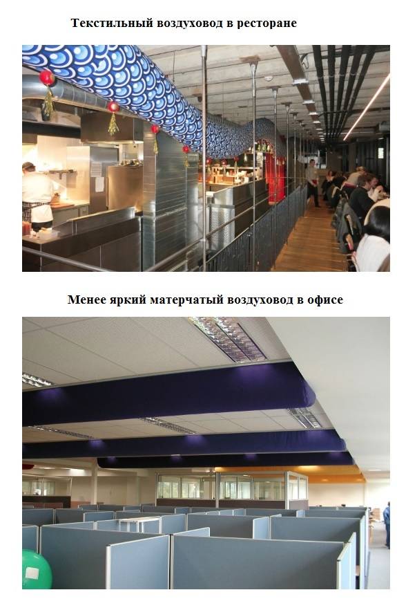 Die Projektentwickler werden wahrscheinlich eine traditionelle Belüftung mit abgehängten Decken entwerfen, die die verzinkten Luftkanäle abdecken. Deshalb möchte ich Sie warnen - es gibt textildurchlässige Luftkanäle, die keinen Zugluft-Effekt erzeugen - sie geben über die gesamte Länge frische Luft ab (beigefügter Screenshot). Wenn Sie sie anwenden, ist eine abgehängte Decke, die das Raumvolumen verringert, nicht erforderlich.