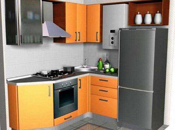 Eine gute Option für eine kleine Küche - eingebauter Kühlschrank. Die Oberflächen einer solchen Vorrichtung sind mit Platten aus Spanplatten oder MDF ummantelt. Der Rahmen der Box schützt das Gerät nicht nur vor Erwärmung, sondern isoliert auch die Metallwände vor Schmutz und Fettspritzern. Um die Wärmedämmeigenschaften zu verbessern, kann eine Folie oder eine andere Isolierung von der Seite des Gasherds auf die Oberfläche geklebt werden.