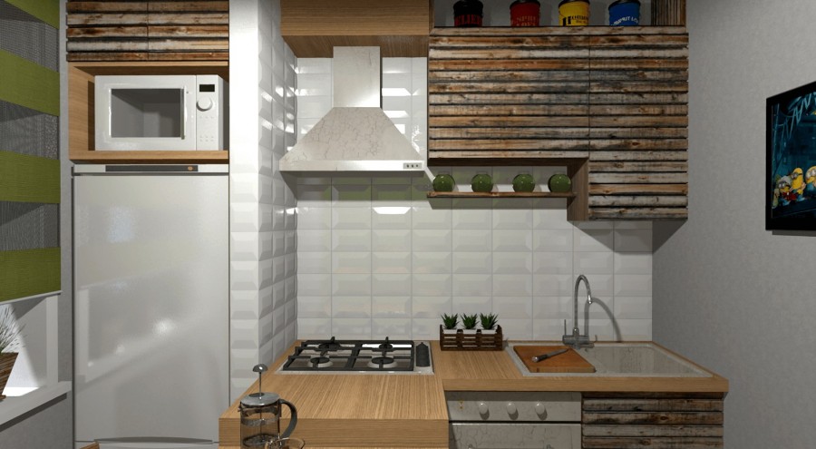 Das Ersetzen von Geräten in voller Größe durch kleinere Versionen hilft dabei, freien Speicherplatz zu gewinnen. Sie können beispielsweise einen Ofen mit zwei Brennern installieren. Es stellt sich also heraus, dass der Abstand zwischen den Fliesen und dem Kühlschrank auf 15 bis 20 Zentimeter vergrößert wird.
