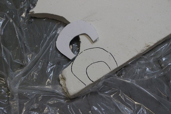 Der Boden, es ist der feuerfeste Arbeitstisch der Schmiede, ist fertig. Jetzt fangen wir an, die Rückwand anzuordnen:
