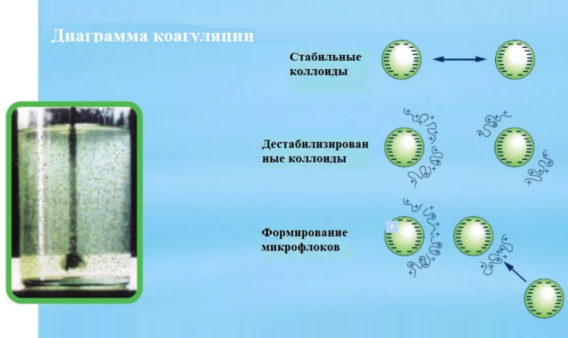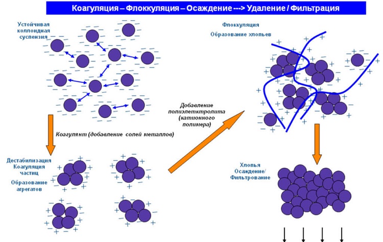 Die Koagulation ist ein Verfahren zur Wasserreinigung durch Anhaften umweltschädlicher dispergierter Substanzen zur anschließenden Entfernung durch ein mechanisches Verfahren durch Filtration. Die Kombination von Schadstoffen erfolgt aufgrund der Einführung von Gerinnungsreagenzien, wodurch die Bedingungen für die einfachste Beseitigung verwandter Schadstoffe aus dem behandelten Wasser geschaffen werden.
