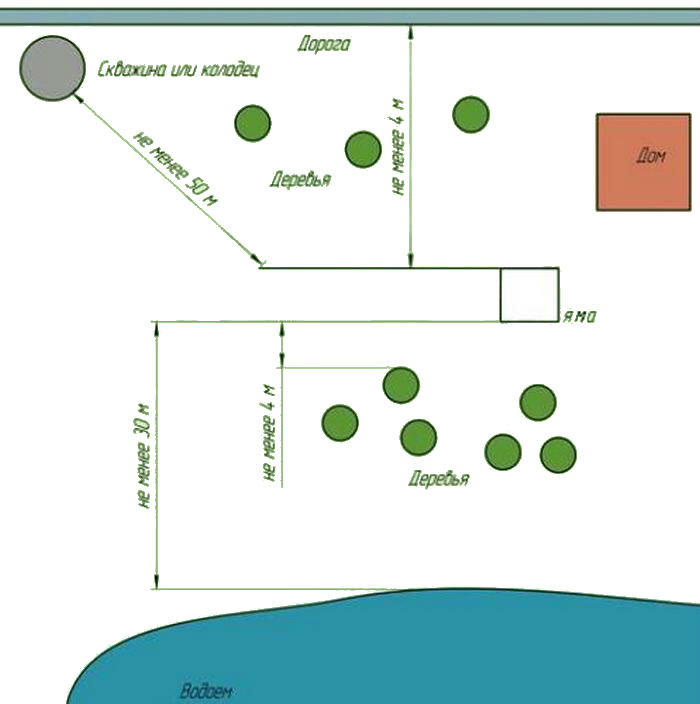 - Der nächste Brunnen oder Tiefbrunnen mit Trinkwasser sollte 50 m oder mehr betragen. In der Praxis ist die Einhaltung dieser Norm sehr schwierig. Mit Genehmigung des SES wird dieser Abstand auf 30 m reduziert.