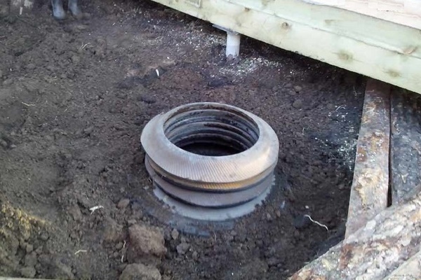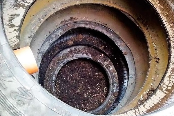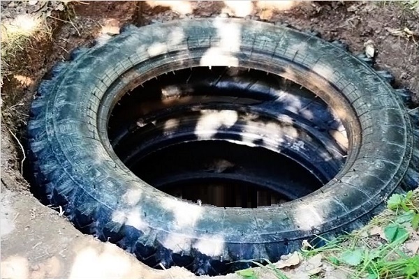 Am Boden einer Art Mine wird der erste Reifen platziert, der durch die Mine fährt Abflussrohr. In ähnlicher Weise senkt sich der zweite Reifen in die Grube und die Seiten benachbarter Räder sind auf bequeme Weise verbunden.