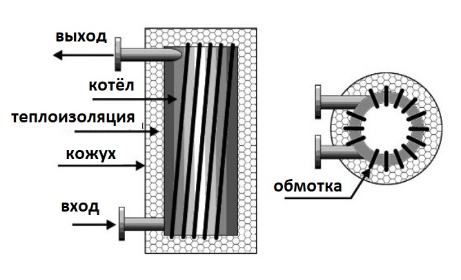 - Heizelement. Dies ist der Kern der Spule. Für den Kessel erfolgt dies in Form eines Rohres mit ausreichend großem Durchmesser oder mehrerer parallel geschalteter Rohre mit kleinerem Querschnitt.