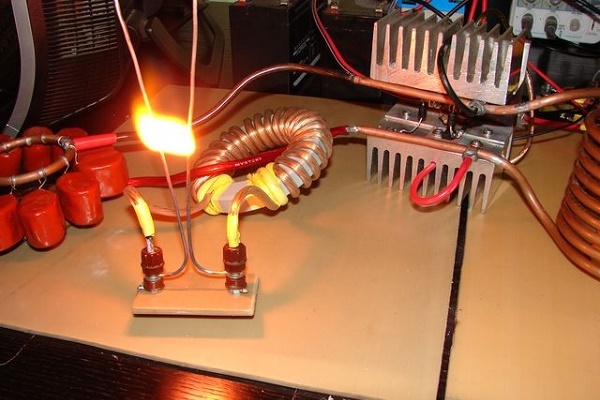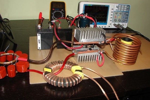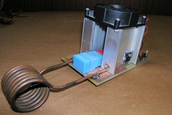 In dieser Form kann das Gerät bereits arbeiten, aber die Heizung ist schwach. Um es zu verstärken, müssen Sie einen hochfrequenten elektrischen Strom durch die Spule leiten. Daher muss das Gerät mit einem Wechselrichter und einem Gleichrichter ergänzt werden.