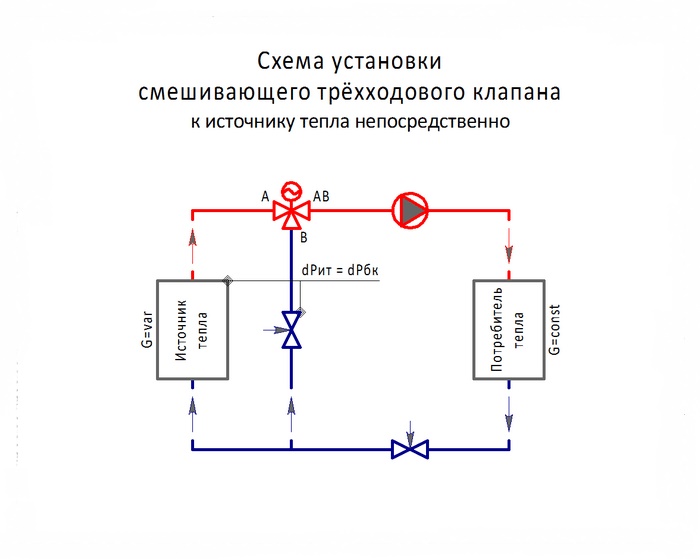 Das Mischventil ist ebenfalls montiert, um die Ströme zu trennen. Die Notwendigkeit hierfür entsteht, wenn es nicht akzeptabel ist, den Quellkreis vollständig zu isolieren, die Flüssigkeit jedoch in den Rücklauf umgangen werden kann. Meistens wird diese Option bei Vorhandensein eines autonomen Heizraums verwendet.