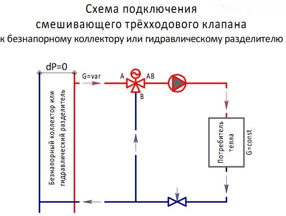 Beim Einsetzen eines Dreiwege-Mischventils in das Fernwärmesystem gibt es mehrere Möglichkeiten. Die Wahl des Schemas hängt von der Art des Anschlusses des Heizungssystems ab.