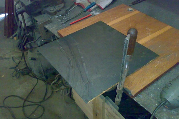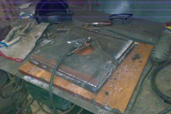 Sie schweißen den Boden und die Abdeckung auf die Bremsscheibe. Es wird eine Pfanne oder Verdampferschale sein. Um Kraftstoff in den Deckel zu bringen, lassen Sie eine Öffnung frei, durch die Luft in den Dickbauchofen strömt. Die Öffnung ist ziemlich weit gemacht, sonst nimmt der Luftzug ab und das Öl fällt nicht in die Schüssel.