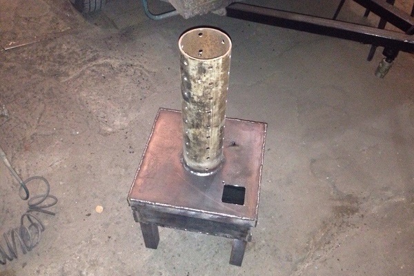Ein Brenner besteht aus einem Rohr mit einer Länge von 20 und einem Durchmesser von 10 cm. Der untere Teil wird durch Bohren von Löchern mit einem Durchmesser von etwa 2 cm perforiert. Sie reinigen das Innere der Grate, andernfalls sammeln sie Ruß an sich selbst, wodurch das Loch später erheblich verengt wird.