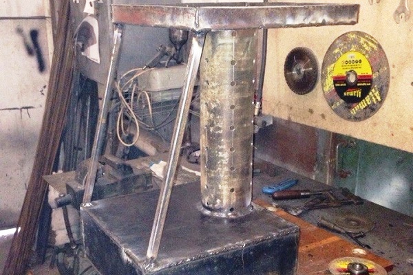 Es ist am einfachsten, einen Tank aus Rohren mit großem Durchmesser herzustellen. Ein Boden und Beine sind mit einem Rohrstück mit einem Durchmesser von ca. 35 cm verschweißt. Um den Tank zu schließen, nehmen Sie ein kleines Stück Rohr mit einem etwas größeren Durchmesser, schweißen Sie einen Deckel daran und bohren Sie dann zwei Löcher hinein - eine Steuerung mit einem Durchmesser von ca. 60 mm und die andere unter dem Injektor.