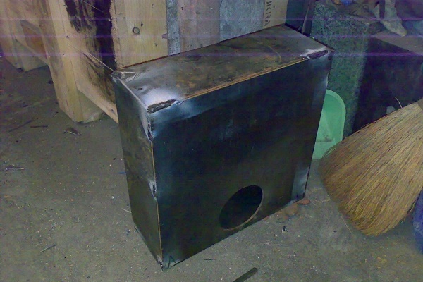 Die minimale Wandstärke des Wärmeübertragungstanks beträgt 0,3 cm. Er wird mit der gleichen Technologie wie der Kraftstofftank hergestellt. Es ist besser, die Oberseite flach zu machen, und das Loch für den Schornstein sollte verschoben werden. Dann kann bei Bedarf eine Pfanne oder ein Wasserkocher auf den Herd gestellt werden.