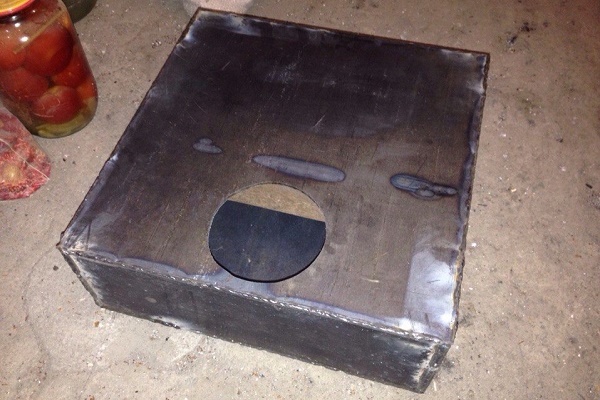 An dem für den Schornstein vorgesehenen Loch ist ein Kanal angeschweißt - ein Rohr mit einer Höhe von 5 bis 10 cm und einem Durchmesser von 10 cm.