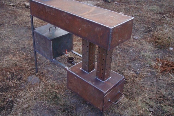 - Wärmetauscher in Form eines Tanks über der Brennkammer. Das erhitzte Gasgemisch tritt ein. Das Design kann jede Größe und Form haben. Idealerweise ist dies ein Tank mit einer hohlen Plattform, auf der Sie Lebensmittel erhitzen können.