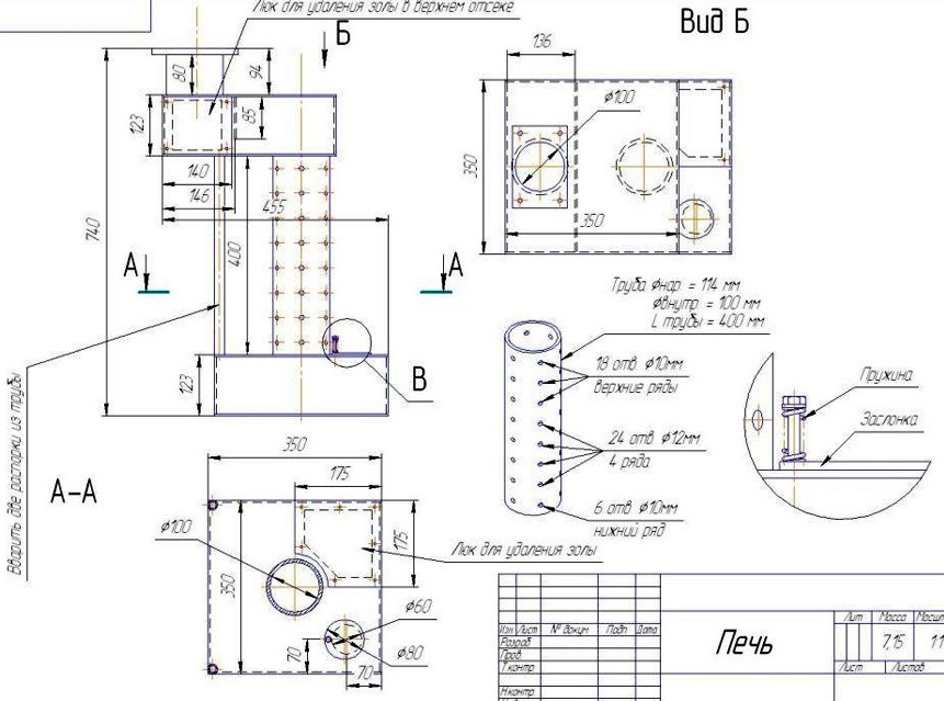 Die Herstellung eines Arbeitsofens, die wir im Beispiel betrachten werden, wurde gemäß der folgenden Zeichnung durchgeführt. Das Schneiden von Stahlblech wurde vorab auf einer Maschine mit einer Guillotine durchgeführt. Ein Dreher bohrte 54 Löcher in das Rohr.