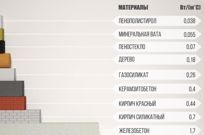 Die Berechnung berücksichtigt sowohl die Dicke als auch den Wärmeleitfähigkeitskoeffizienten jeder der Strukturen. Normative Werte Wärmeleitfähigkeitskoeffizient (λ) für die am häufigsten verwendeten Materialien kann der Tabelle entnommen werden.