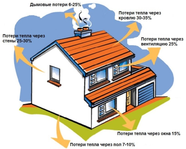 Auf die gleiche Weise werden Wärmeverluste durch die verbleibenden umschließenden Strukturen berechnet: Fenster, Türen und Dächer.