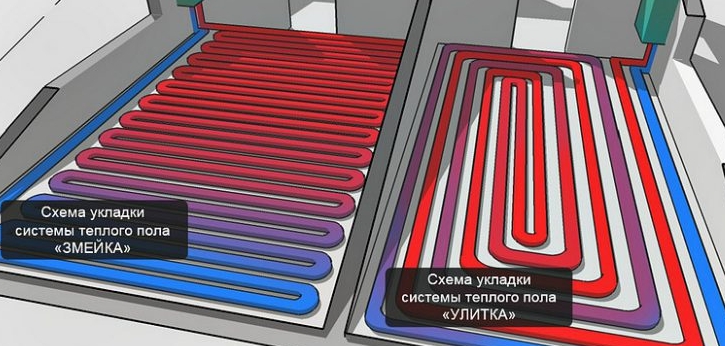Für das Gerät des Bodens mit Warmwasserbereitung unterschiedlich Rohrverlegungsmethodengekennzeichnet durch ihre Form: eine Schlange von drei Arten - die eigentliche Schlange, eckig, doppelt und Schnecke. In einer montierten Schaltung kann eine Kombination verschiedener Formen gefunden werden. Manchmal wird eine Schnecke für die zentrale Bodenzone und eine der Schlangenarten für die Ränder ausgewählt.
