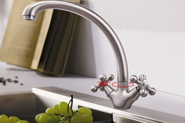Ein weiterer wichtiger Parameter bezüglich der Geometrie des Mischers ist der Drehwinkel. Wenn sich die Spüle in der Nähe der Wand befindet, installieren Sie den Mischer einfach mit einem Drehwinkel von bis zu 90 Grad. Wenn Sie eine Spüle mit zwei Schalen verwenden, müssen Sie auf Modelle mit einem Drehwinkel von 180-360 Grad achten.