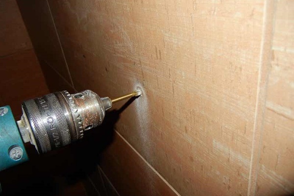 Wir nehmen einen Bohrer mit einem Bohrer und bereiten an den vorgesehenen Stellen Löcher für Befestigungselemente vor. Ihre Tiefe sollte die Länge der Dübel geringfügig überschreiten, und der Durchmesser sollte geringfügig kleiner sein als der Querschnitt der Buchsen. Ein wenig Kleber kann in die Löcher gegeben werden, damit die Stopfen besser halten.