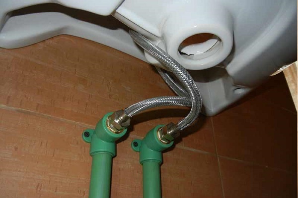 Nachdem der Mischer befestigt ist, können Sie ihn an die Wasserversorgung anschließen. Am häufigsten werden für diese Zwecke flexible Eyeliner verwendet. Wir verbinden sie mit den Rohren. Wir bringen heißes Wasser zum linken Schlauch und kaltes Wasser zum rechten.