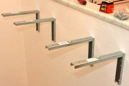 Wir verbinden beide Markierungen mit einer Linie, die die Montagehöhe der Halterungen anzeigt. Nehmen Sie danach das Waschbecken und drehen Sie es um. Dann befestigen wir die Halterungen an den Seitenwänden. Bringen Sie danach die Schüssel auf die obere horizontale Markierung an und drücken Sie sie gegen die Wand.