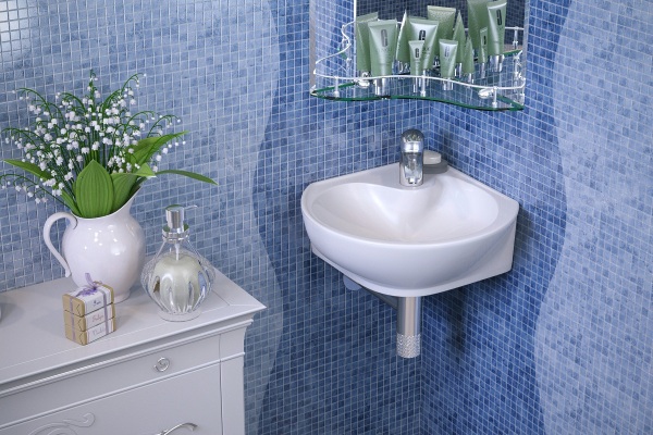 Manchmal wird eine herkömmliche vordere Spüle durch diagonale Montage in eine Ecke gestellt. Hierzu wird eine in einem Winkel von 45 ° befestigte Installation verwendet. Diese Lösung ist jedoch nur für große Badezimmer möglich.