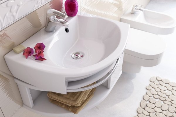 Zuvor war das gesamte Sortiment an Eckwaschbecken auf einfache, eigenständige weiße Sanitärarmaturen reduziert, die zur Economy-Klasse gehören.