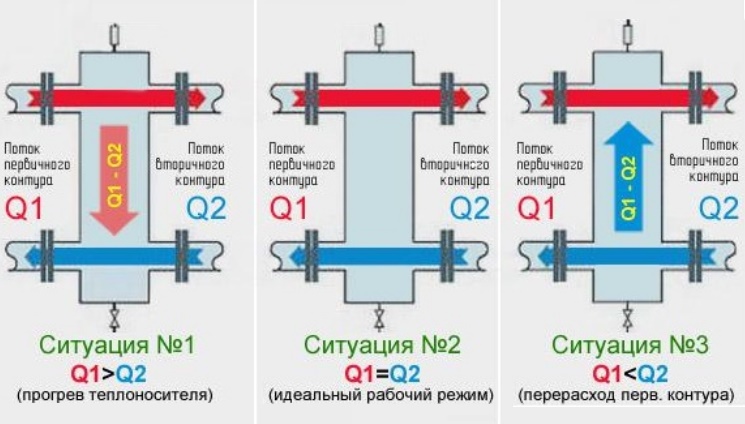 Vorbehaltlich der Leistung Kühlmittel eingestellte Temperatur, Sekundärkreise des Heizungssystems werden aktiviert. Die Kühlmittelströme des Primär- und Sekundärkreislaufs sind ausgerichtet. Unter solchen Bedingungen fungiert die Wasserpistole nur als Filter und Entlüftungsöffnung (Q1 = Q2).