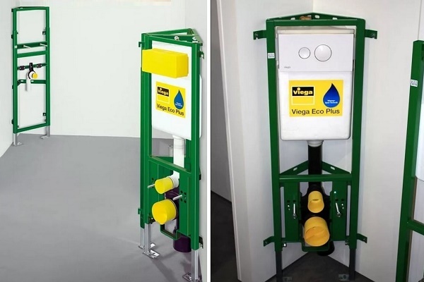 Um die Installationsaufgabe zu vereinfachen, stellen die Hersteller kompakte Modelle her, bei denen sich der Tank in einem speziellen Regal befindet. Sie sind leiser und pflegeleichter. Es gibt auch Toiletten mit eingebauten Zisternen. Sie sind in einer Nische maskiert und nur der Spülhebel bleibt draußen. Es ist sehr ästhetisch ansprechend, erschwert jedoch Inspektionen und Reparaturen.