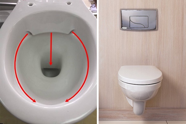 - Rückwärts (kreisförmig) Das Spülen wird durch viele kleine Löcher verursacht, die um den Umfang des oberen Teils der Schüssel herum angeordnet sind. Aufgrund der Tatsache, dass diese Löcher schräg angeordnet sind, fließt Wasser spiralförmig aus ihnen heraus und verdreht sich zu einem starken Trichter. Dies trägt nicht nur zu einer verbesserten Spülqualität bei, sondern auch zu einer angemessenen Durchflussrate.