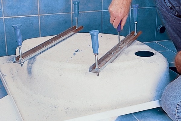 Zuerst produziert Palettenmontagewenn es durch das Design der Dusche vorgesehen ist. Dieses „Bad“ ist auf verstellbaren Stützen installiert, mit denen Sie die Höhe vom Boden aus einstellen können. Mit ihrer Hilfe wird die horizontale Anordnung der Seite eben ausgeglichen.