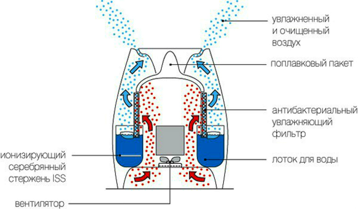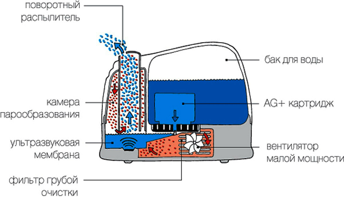 Ultraschallmodelle erzeugen Feuchtigkeit aufgrund mechanischer Vibrationen auf einer speziellen Membran. Das in diese Einheit eintretende Wasser wird in feine Partikel aufgeteilt, die vom vom Ventilator erzeugten Luftstrom abgeführt werden. Der Prozess wird ohne Erhitzen durchgeführt, jedoch werden zusammen mit Wasser alle in der Flüssigkeit enthaltenen Verunreinigungen in Fraktionen aufgeteilt.
